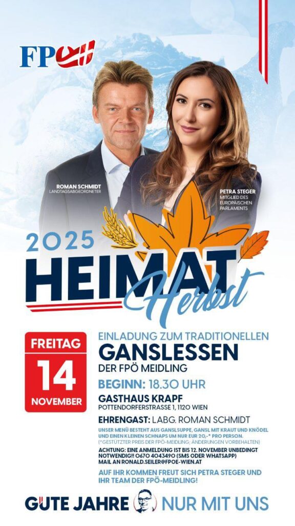 Am Freitag, den 14. November, lädt die FPÖ Meidling wieder zum traditionellen Ganslessen ins Gasthaus Krapf ein.